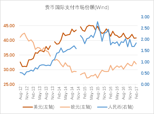 2016年“一带一路”跨国金融合作研究报告显示,2012年以来,人民币在跨境贸易和投资中的使用规模和范围迅速扩大(见图四),但主要的跨境收付量发生在港澳台和新加坡地区,在“一带一路”国家的规模相对较小。人民币国际支付市场份额自2012年以来也有大幅提高,但是美元、欧元相比依然想去甚远(见图五)。
