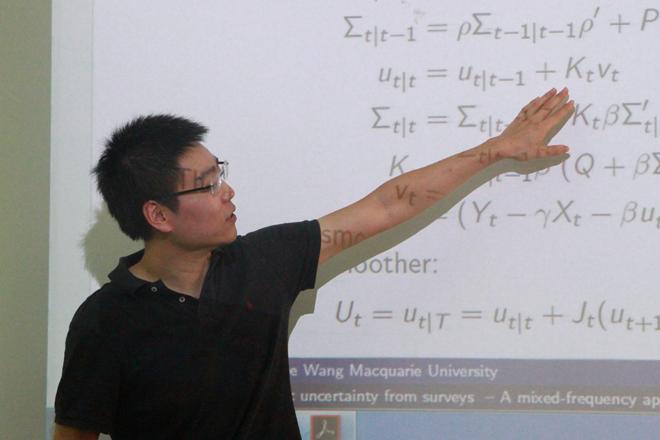 7月4日下午,教育部人文社会科学重点研究基地――厦门大学宏观经济研究中心(CMR) Seminar 2017年第八讲(总第210讲)在经济楼A201举行。澳大利亚麦考瑞大学经济系王哲教授报告了其最新研究“基于调查数据测定宏观不确定性:一种混合频次方法”(Measuring macroeconomic uncertainty from surveys - A mixed frequency approach )。中心副主任龚敏教授主持此次Seminar并为王哲教授颁发讲座纪念牌。