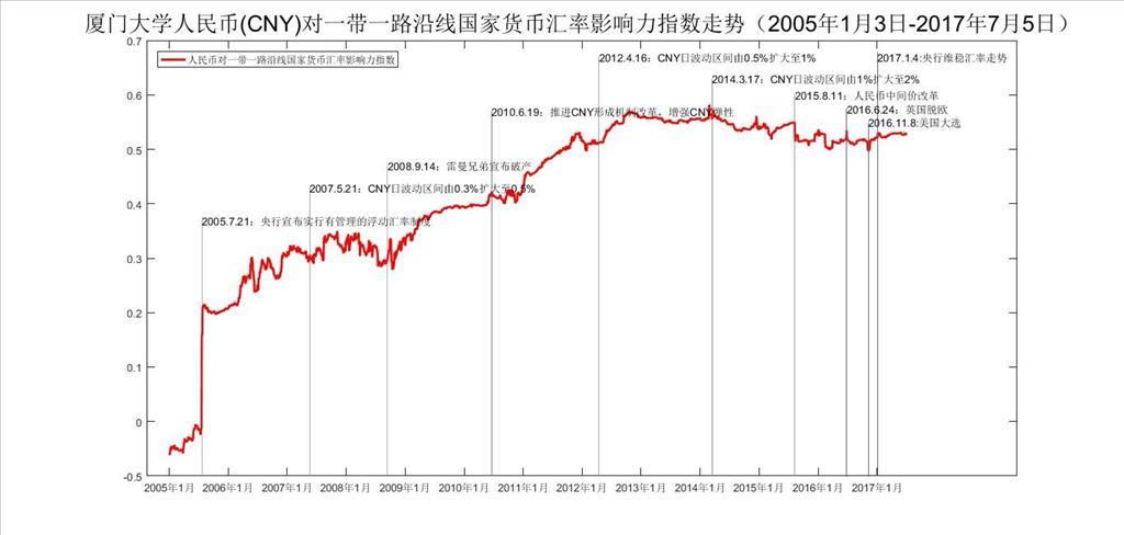 2016年6月6日厦大经济学科首次发布人民币汇率国际影响力指数,就受到了社会各界的广泛关注。7月21日和8月11日又分别新增发布离岸人民币汇率(CNH)国际影响力指数和人民币中间价(CNYMUSD)国际影响力指数,回顾两次人民币汇改的市场化和国际化历程。2017年2月,厦大经济学科编制了基于G20国家的新指数,反映人民币汇率的变化对G20国家、发达国家、发展中国家和亚洲主要货币汇率的影响。 2017年3月,厦门大学新增发布了金砖五国货币汇率对G20国家货币的影响力指数,说明人民币汇率国际影响力一枝独秀、各国货币合作机制亟待深化。2017年4月和5月,厦门大学新增发布了人民币汇率对一带一路沿线国家货币影响力指数,自2017年以来特别是“一带一路”高峰论坛的召开,有明显的上扬。同时,人民币已成为“一带一路”沿线主要国家或地区货币网络的中心。