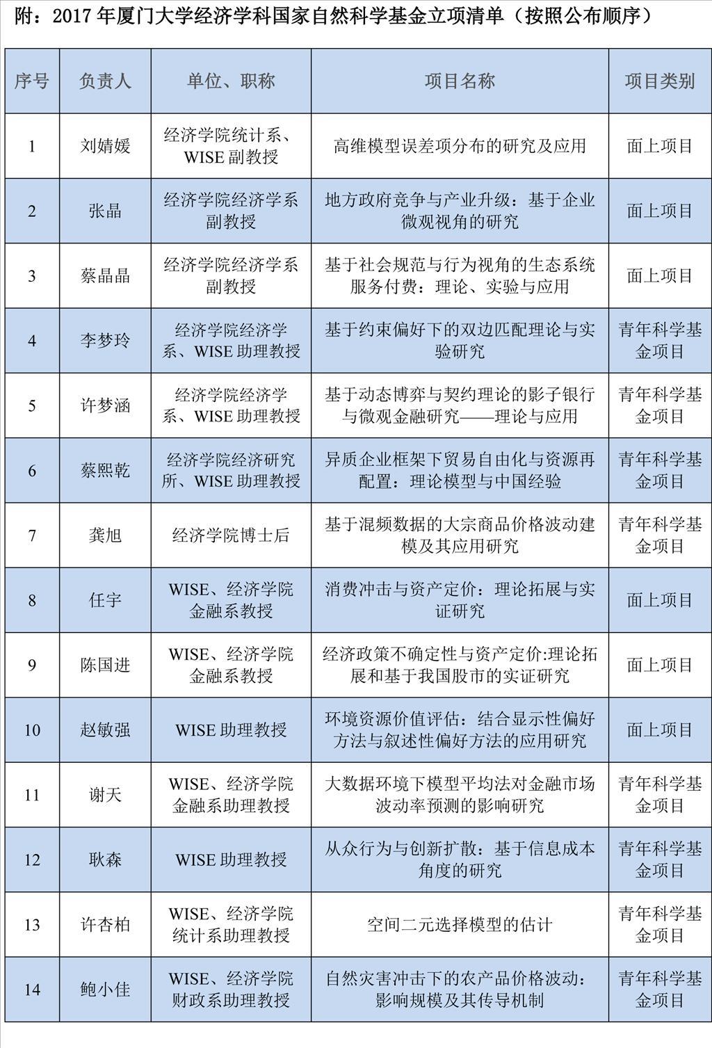8月17日,国家自然科学基金委员会公布了2017年度国家自然科学基金申请项目评审结果。厦大经济学科延续2011年以来的强势表现,共有14项课题获得基金资助项目立项,其中:面上项目6项,青年科学基金项目8项,获资助直接经费总额为429万元。