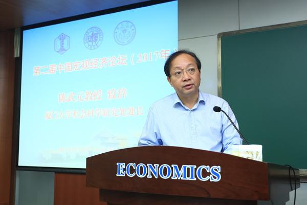 开幕式于经济楼N302室举行。在厦门大学宏观经济研究中心副主任龚敏教授宣布论坛开始后,厦门大学社科处处长陈武元教授首先致辞。陈武元教授对远道而来的各位嘉宾与代表致以热烈的欢迎和诚挚的问候。他表示,刚刚胜利闭幕的十九大给高等教育发展提供了方向,也创造了新的机遇。中国特色社会主义进入了新时代,新时代呼唤着新理论,新理论需要立足于中国实践。中国的经济学家要去深入研究、协同创新,为形成中国特色的现代经济理论、为世界范围内的现代经济学的发展提供中国智慧和中国方案,为实现中华民族伟大复兴的中国梦而共同努力。他希望不仅论坛的三家发起单位今后更紧密地合作,而且有更多的大学、学术单位参与此事,通过大家的长期合作、共同建设,将这个论坛建设成为国内最有影响力的中国宏观经济论坛之一。他表示,今后,厦门大学将继续支持中国宏观经济论坛的举办,并努力把它建设成为新时代中国特色现代宏观经济理论的重要学术交流平台。