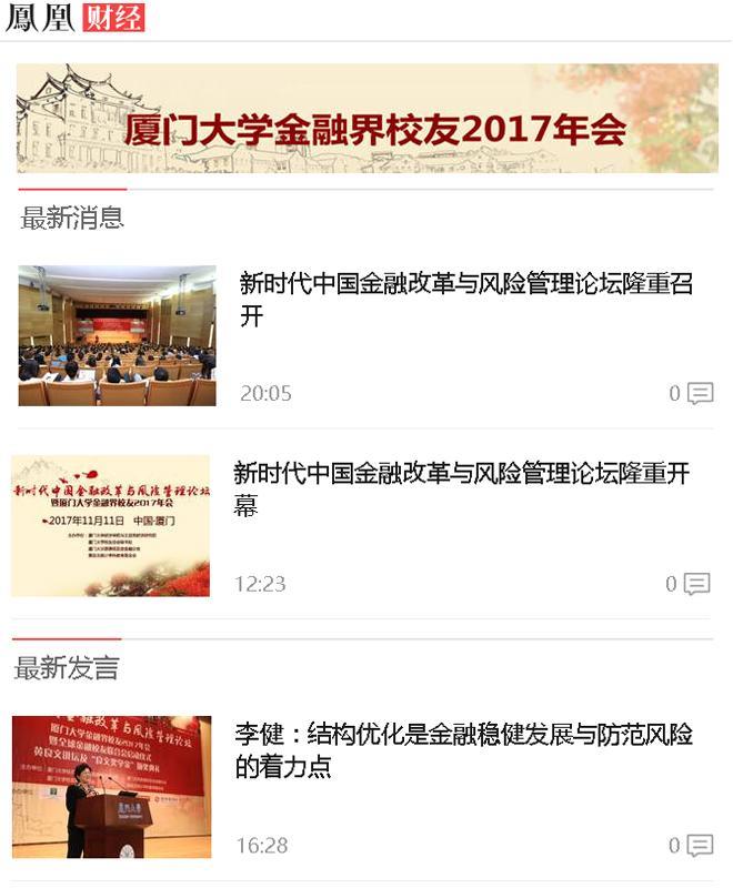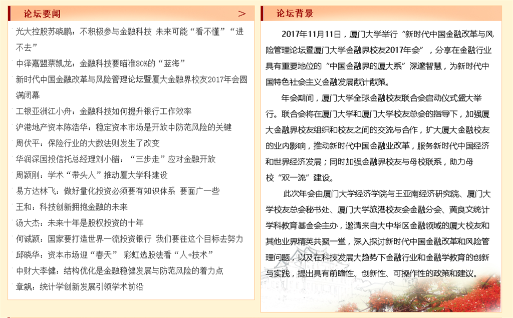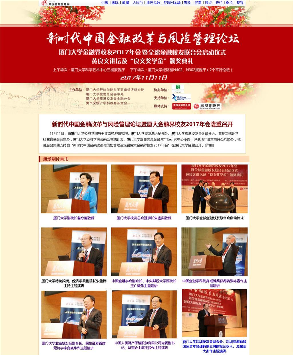 11月11日,由厦门大学经济学院与王亚南经济研究院、厦门大学校友总会秘书处、厦门大学旅港校友会金融分会、黄良文统计学科教育基金会主办,厦门大学经济学院金融系与统计系、厦门大学富邦两岸金融与产业研究中心承办,沪港地产资本有限公司协办,德健金融集团支持的“新时代中国金融改革与风险管理论坛暨厦大金融界校友2017年会、厦大全球金融联合启动仪式”在厦门大学隆重举行。年会引起众多新闻媒体的广泛关注,形成了报刊、网站、新媒体等多种媒体的立体式报道,社会各界反响强烈。