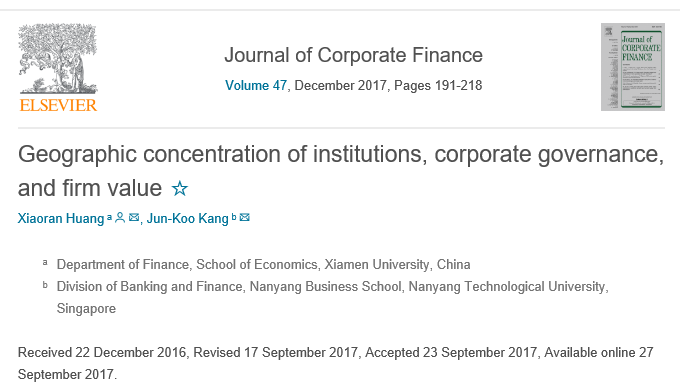 12月初,黄晓然作为第一作者与新加坡南洋理工大学教授Jun-Koo Kang合作的论文“Geographic Concentration of Institutions, Corporate Governance, and Firm Value”在Journal of Corporate Finance 2017年第47卷正式刊出。黄晓然于2016年获新加坡南洋理工大学金融学博士学位后,加盟厦大经济学科,受聘为经济学院金融系与王亚南经济研究院(WISE)助理教授。其研究领域为公司金融、机构投资、公司治理、风险管理、行为金融学等。