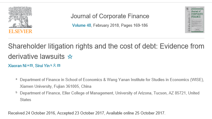 倪骁然作为第一作者与美国亚利桑那大学Sirui Yin合作的论文“Shareholder litigation rights and the cost of debt: Evidence from derivative lawsuits”已于近日在线发表于Journal of Corporate Finance,即将于第48卷正式刊出。倪骁然于2017年获清华大学经济管理学院金融学博士学位后,加盟厦大经济学科,受聘为经济学院金融系与王亚南经济研究院(WISE)助理教授。其研究领域为公司金融、公司治理、中国资本市场。倪骁然也是今年厦大经济学科延揽的国内优秀人才之一,论文发表在Journal of Corporate Finance, Economics Letters以及《经济学(季刊)》、《管理世界》等期刊上。