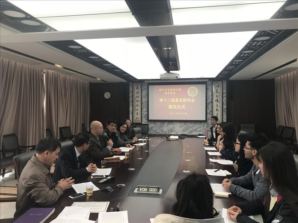 12月18日中午,经济学院经济学系第十二届“系友助学金”颁发仪式在经济楼N501举行。经济学系92级系友连任、93级系友张云龙,经济学院党委副书记邱旺土,经济学院教授、经济学系主任龙小宁,经济学院副教授、经济学系副主任赵建,经济学院教授、经济学系92级班主任郭其友,经济学院团委副书记陈启妍以及受助学生参加了仪式。