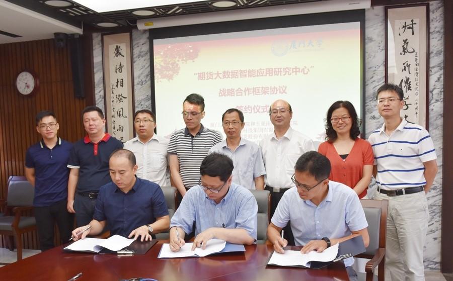 8月6日,厦门大学经济学院、王亚南经济研究院与网智天元科技集团股份有限公司(以下简称:网智天元科技)、瑞达期货股份有限公司(以下简称瑞达期货)成立“期货大数据智能应用研究中心”签约仪式在经济楼举行。网智天元科技总裁蔡锦森、总经理蓝明达,瑞达期货副总经理陈忠文,经济学院党委书记黄鸿德、党委副书记周蕾、洪永淼教授、副院长朱孟楠,计量经济学教育部重点实验室(厦门大学)副主任钟锃光出席签约仪式。