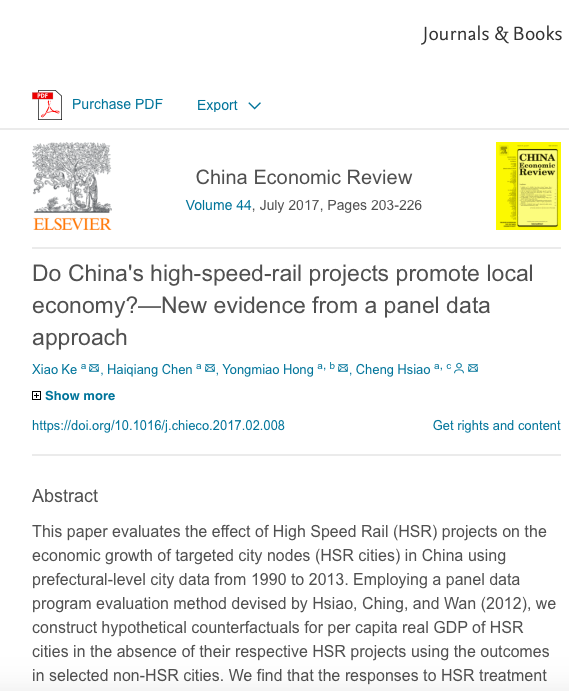 近日,China Economic Review 2017年度最佳论文奖揭晓。由厦门大学王亚南经济研究院博士生柯潇(第一作者),与经济学科教授陈海强,美国南加州大学教授萧政合作发表于第44期的论文“Do China’s high-speed-rail projects promote local economy?—New evidence from a panel data approach”,荣膺该奖项。该论文是柯潇博士论文的重要组成部分。