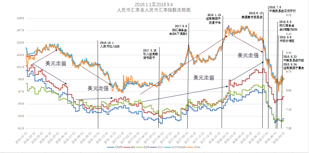 今年以来,受强美元和贸易战的交织影响,人民币兑美元汇率跌跌不休。3月21日和6月14日,美联储连续二次加息,将联邦基金利率目标区间上调到1.75%至2%的水平。无独有偶,在每次加息的次日,特朗普政府都宣布了使中美贸易摩擦升级的措施,使得此前在年内对一揽子货币呈现强势的人民币汇率指数自6月中旬以来也出现了一波快速贬值,这在7月6日中美贸易战正式开打后尤为明显,如图2示。