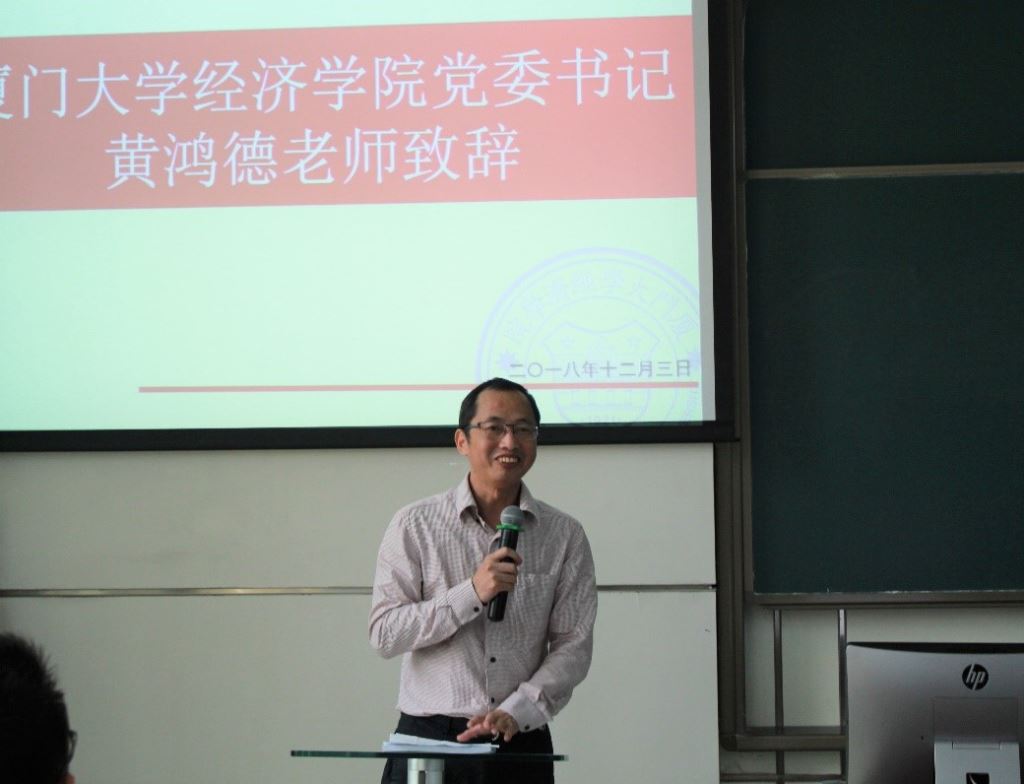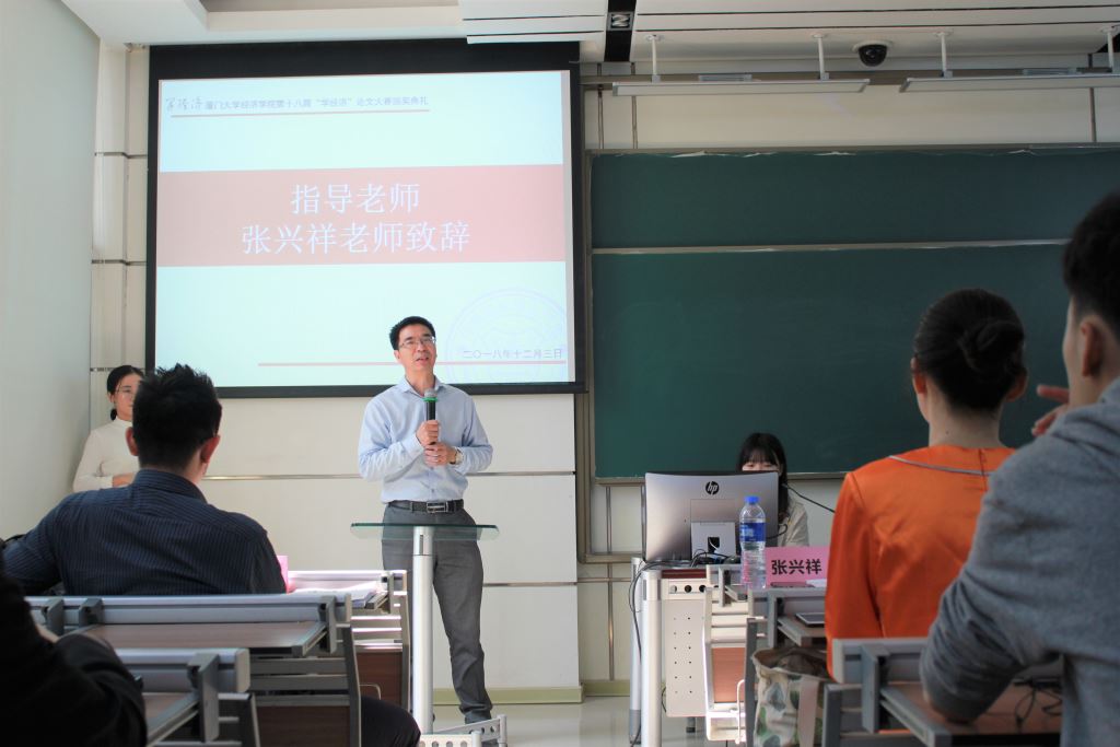12月3日中午,厦门大学经济学院第十八届“学经济”论文大赛颁奖典礼在经济学院D136顺利举行。本次大赛由厦门大学经济学院、厦门大学国家经济学人才培养基地主办,厦门大学经济学院习近平新时代中国特色社会主义思想读书社、厦门大学马克思主义政治经济学学习社、厦门大学《资本论》研习社承办。经济学院党委书记黄鸿德、经济学院党委副书记周蕾、经济学系教工党支部书记张兴祥、经济学系副主任赵建、《学经济》主编李嘉楠、辅导员徐惠聪、刘长青出席了颁奖典礼。