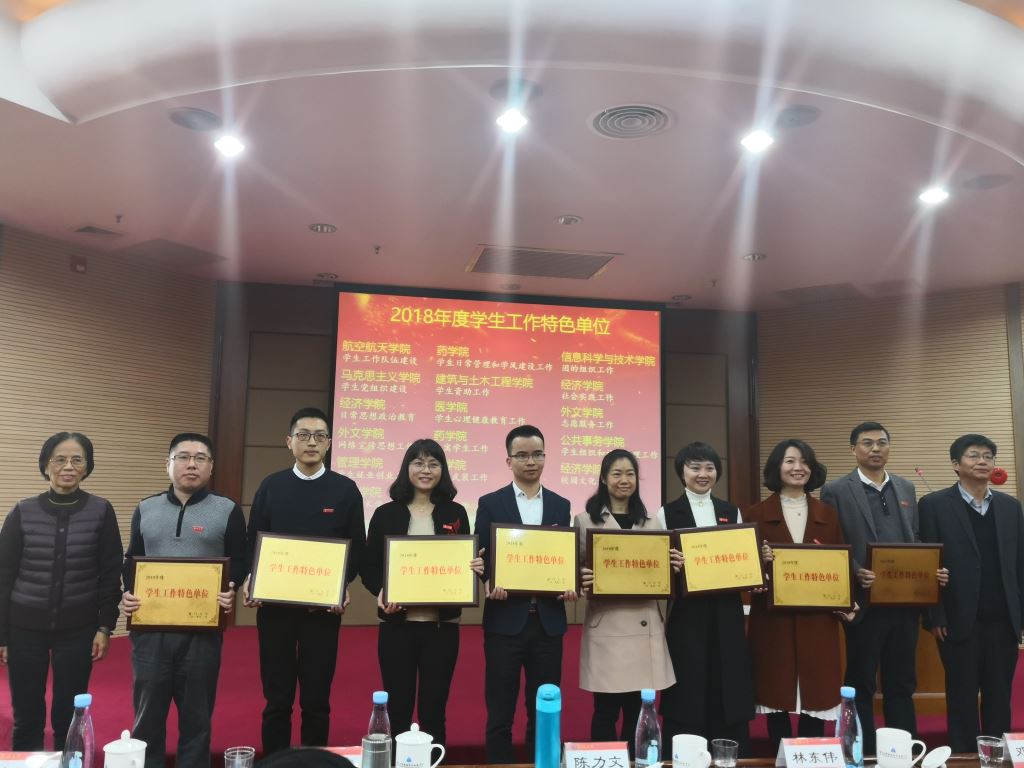 2019年1月17日,厦门大学2018年度学生工作总结表彰大会在克立楼报告厅举行。大会对学生工作先进单位和特色单位以及优秀辅导员进行了表彰。经过对各个学院学生工作队伍建设、学生党组织建设、日常思想政治教育、网络宣传思想工作、学生就业创业工作、学生日常管理和学风建设工作、学生资助工作、学生心理健康教育工作、学生公寓管理工作、团的组织工作、社会实践、志愿服务、学生组织和社团管理、校园文化活动、学生学术学业科技创新创业工作等16个方面工作的综合考核和评价,经济学院总分第一再次荣膺“学生工作先进单位”;同时经济学院还在“日常思想政治教育”“社会实践工作”“校园文化活动工作”三个专项上单项得分第一荣获“学生工作特色单位”称号;辅导员陈启妍、林轶凡荣获“优秀辅导员”称号。