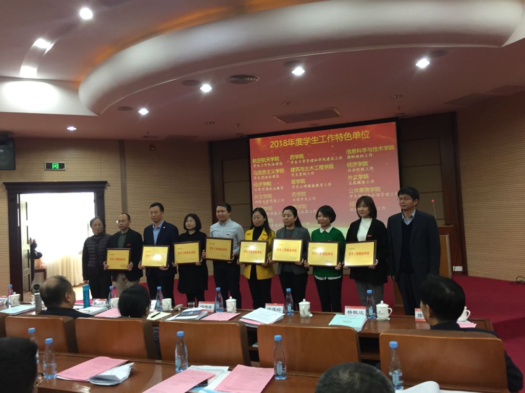 赵小姝(右三)、刘长青(左五)代表学院接受学生工作特色单位表彰