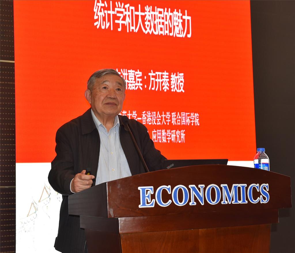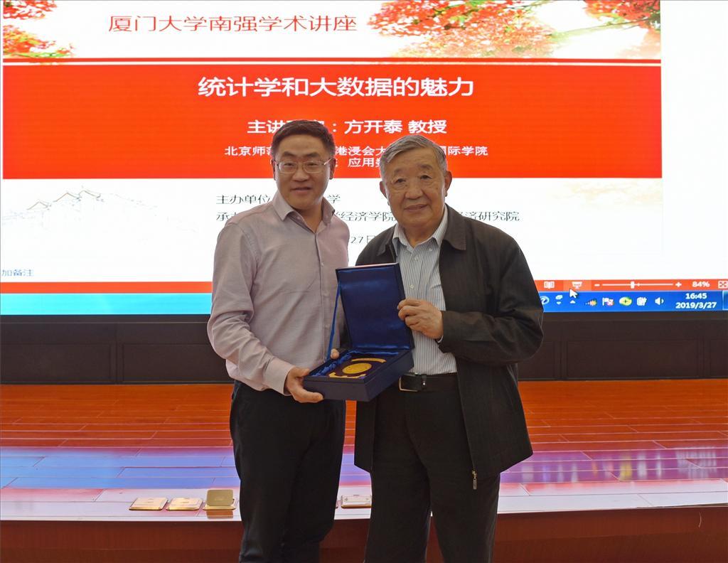2019年3月27日下午,北京师范大学--香港浸会大学联合国际学院、中国科学院应用数学研究所方开泰教授应邀做客厦门大学“南强学术讲座”,在厦大经济楼为广大师生带来了题为“统计学和大数据的魅力”的精彩报告。讲座由厦大王亚南经济研究院、经济学院方颖教授主持,讲座开始前,方颖教授向方开泰教授颁发“南强学术讲座”纪念牌。