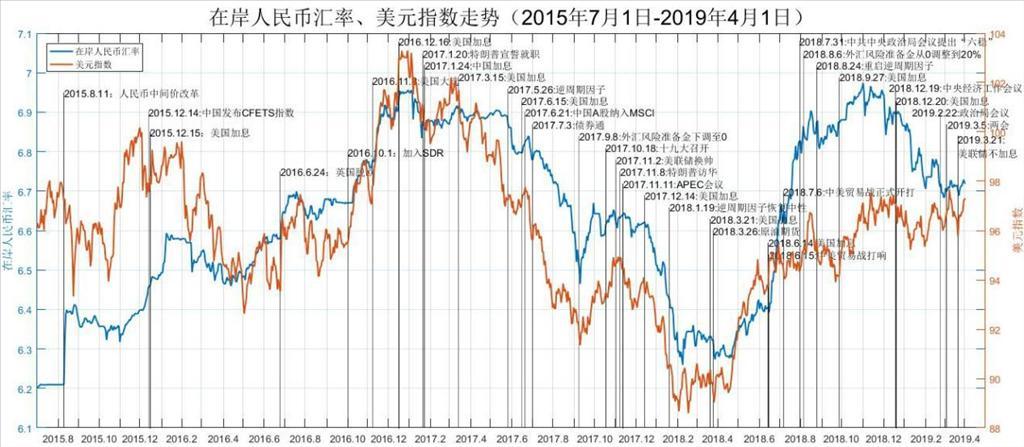 2018年美国一枝独秀,美联储走在全球主要经济体央行紧缩前列,美元也相应强势,但2019年美国经济下行压力增大,3月21日凌晨,美联储公布3月议息会议声明,美联储继续按兵不动,将联邦基金目标利率区间维持在2.25%-2.50%区间。虽然此次会议不加息与市场预期一致,但此次会议声明较预期更为“鸽派”,从而美联储加息周期已经结束,强美元周期结束,人民币汇率的外部压力得到缓解。图3表明从2019年年初至今,美元指数大致呈现窄幅盘整态势,而并未出现显著下降趋势。因此造成人民币汇率显著升值的原因不是由于美元指数走弱。