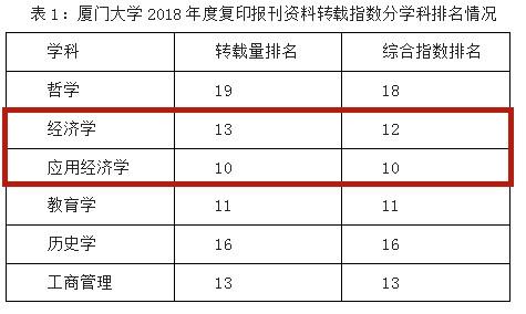 厦大复印报刊资料转载综合指数位列高校第17名,在分学科排名中,经济学第12名,应用经济学第10名。高校所属机构中,厦门大学经济学院与法学院、公共事务学院、管理学院、教育研究院、人文学院、台湾研究院等也都名列前茅。