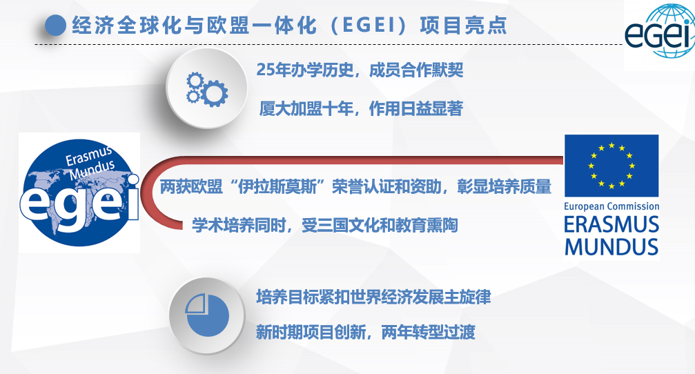 EGEI项目成立于1994年,由比利时已故著名经济学家Wim Muessen联合几家欧洲高校发起,项目最初命名为“欧盟一体化经济学硕士”。基于对全球化重要性的认识,2009年,项目邀请厦门大学加入,并正式更名为“经济全球化与欧盟一体化”硕士项目。