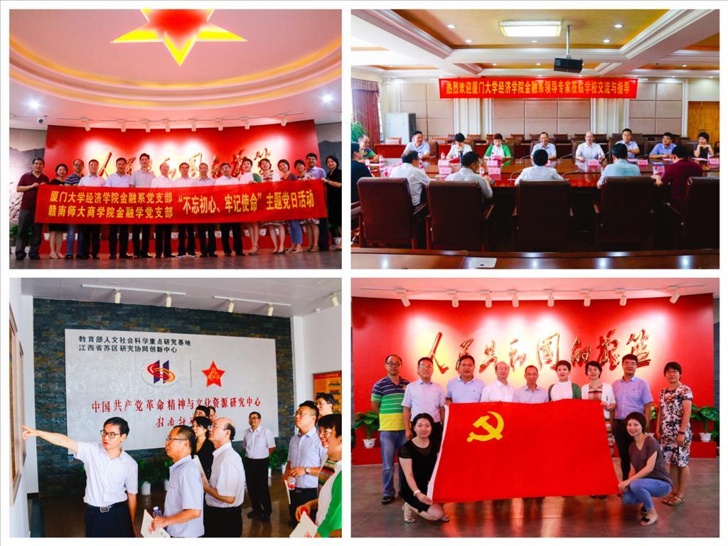 2019年7月10至11日,厦门大学经济学院金融系教工党支部与赣南师范大学商学院教工党支部共同开展了为期两天的“不忘初心、牢记使命”支部共建主题党日活动暨党性教育培训,在江西于都、赣州和瑞金三地,参访革命旧址,缅怀先烈伟绩,传承红色基因,提升党性修养。党支部还充分发挥党建引领作用,调研赣州金融产业发展情况,为地方经济发展献计献策。经济学院党委书记黄鸿德,院党委委员、副院长朱孟楠,金融系教工党支部的部分党员及院党委组织员参加了本次培训。