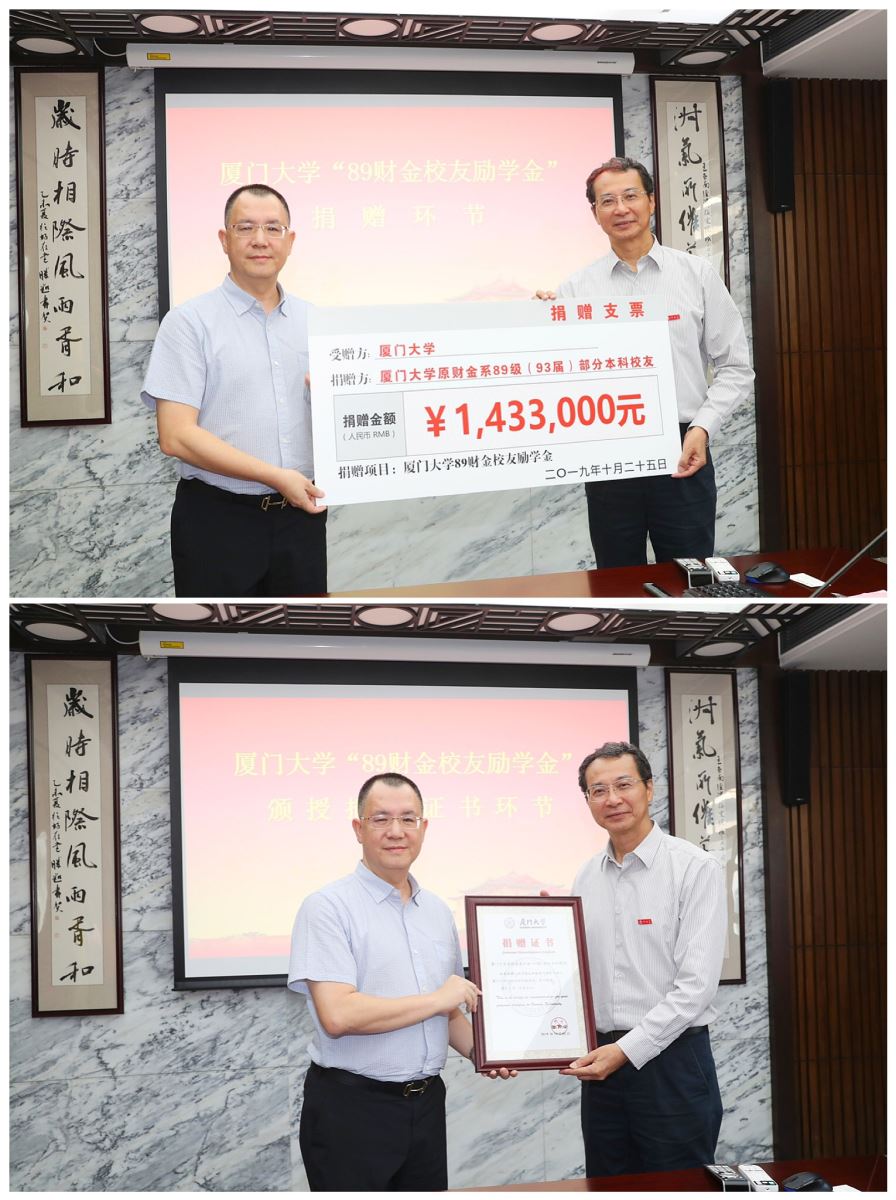 “89财金校友励学金”由厦门大学经济学院1989级财金系66位本科校友捐资设立,定向资助经济学院财政系和金融系家庭经济困难且在校期间已办理校园地国家助学贷款的学生。截止目前,捐赠金额已达到143.3万元。恰逢厦门大学1989级校友入学30周年返校活动前夕,校友们期望借此举弘扬嘉庚精神,感念母校栽培,向母校献礼。