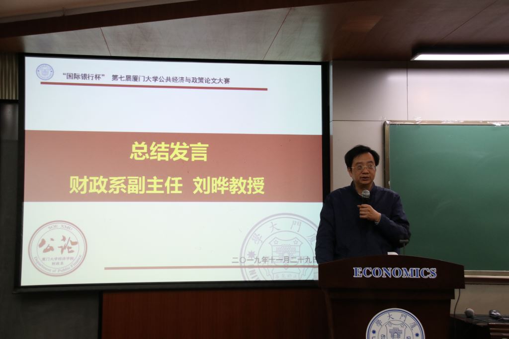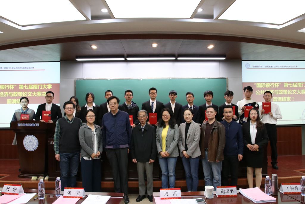 11月29日晚,“国际银行杯”第七届厦门大学公共经济与政策论文大赛在经济学院N302顺利举行。大赛由厦门大学教务处、共青团厦门大学委员会、厦门大学经济学院主办;经济学院财政系、共青团厦门大学经济学院委员会、经济学院科创中心承办;厦门国际银行赞助支持。决赛由经济学院财政系副主任刘晔、财政系谢瑞平、丁锦秀、周斯凡和陈烨担任专业评委。闽都中小银行教育发展基金会副秘书长张莹、经济学院党委副书记周蕾出席了决赛。