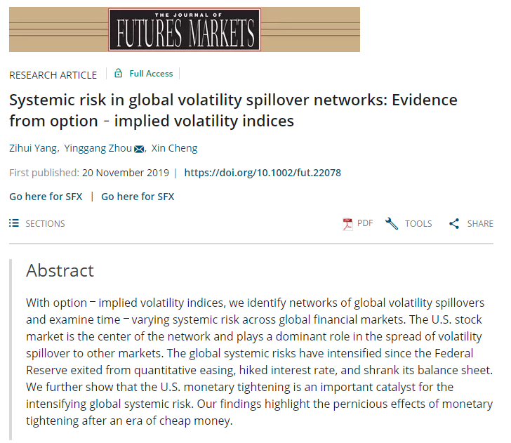 该文研究2011-2018年期间特别是美国退出量化宽松后全球系统风险的变化及其驱动因素。作者使用9个市场的期权隐含波动率指数构造了全球波动溢出网络和全球系统风险(systemic risk)指数,发现美国股票市场占据了全球波动溢出网络的中心位置,并主导了全球系统风险的变化。随着美联储退出量化宽松政策、提高利率并缩减资产负债表,全球系统风险不断加剧,进一步的分析也说明美国货币收缩(monetary tightening)是全球统风险加剧的驱动因素。正如巴菲特的名言,“只有当潮水退去的时候,才知道是谁在裸泳”,近十年大放水之后的缩水让我们看清金融风险和金融危机的源头。