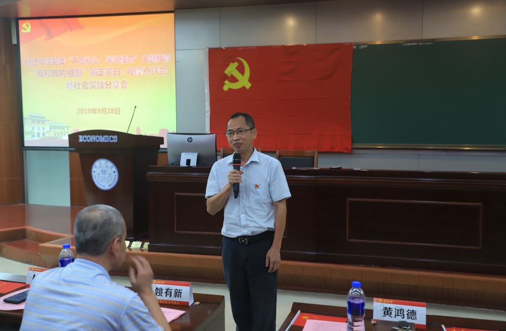 9月28日晚,经济学院党委“不忘初心、牢记使命”主题教育“我和我的祖国”固定党日+观摩点评暨社会实践分享会在学院N303举办。此次观摩点评会邀请了经济学科4名学生党员和1名香港籍学生代表分享在社会实践中的见闻,讲述自己和祖国的故事。校党委组织员、党的建设办公室副主任、校“不忘初心、牢记使命”主题教育巡回指导组第三组副组长姚有新,校团委秘书姚东明,经济学院党委书记黄鸿德,副书记周蕾、杜海林,院党委组织员、团委副书记、辅导员、学生党员和2019级新生代表参加了本次活动。