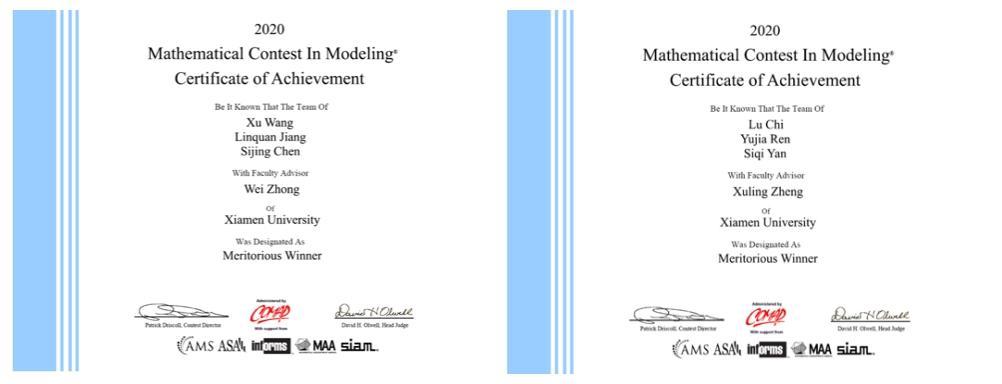 此次大赛中,有两组由经济学院本科生组成的队伍获奖,一组由经济学院大二本科生孙小鲸(18级数理统计国际化试点班)、徐嘉欣(18级金融国际化试点班)、侯景博(18级数理统计国际化试点班)三人组成,指导老师为厦大经济学院统计系与王亚南经济研究院(WISE)副教授刘婧媛;一组由经济学院肖世龙(18级国际商务国际化试点班)、数学科学学院陈贻超、管理学院全泳铮组成,指导老师为厦大经济学院徐明生助理教授。两支有经济学院本科生参与的队伍从全球2万多支参赛队伍、7万余名参赛者中脱颖而出,荣获“特等奖提名奖”(Finalist, F奖),该奖项获奖比例仅为约0.2 %。
