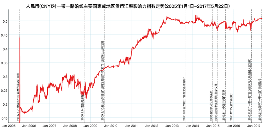 2017年5月14-15日,“一带一路”国际合作高峰论坛在北京举行,加强经贸、金融合作的硕果累累,人民币将更多、更好地为共建“一带一路”服务,扩大人民币的国际影响力。厦门大学经济学科编制的人民币汇率对一带一路沿线国家货币影响力指数,自2017年以来特别是“一带一路”高峰论坛的召开,有明显的上扬。同时,人民币已成为“一带一路”沿线主要国家或地区货币汇率网络的中心。