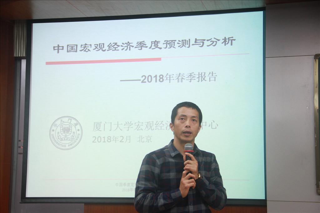 余长林教授展示《百位经济学家2018年中国宏观经济形势与政策问卷调查报告》的结果。本次问卷调查包括2018年世界经济形势、中国经济形势、中国宏观经济政策预测以及防控金融风险和高质量发展等四个部分的问题;接受调查的专家来自财政部、商务部、国家统计局、中国社科院、台湾中华经济研究院等机构以及北京大学、台湾大学、香港城市大学等高校;共收到128份有效问卷回复。余长林教授通过图表直观地向师生展现了问卷调查的结果,并将课题组与调查专家预测结果作了比较。本次问卷调查是宏观中心与新华社经济参考报联合举办的第十次调查。