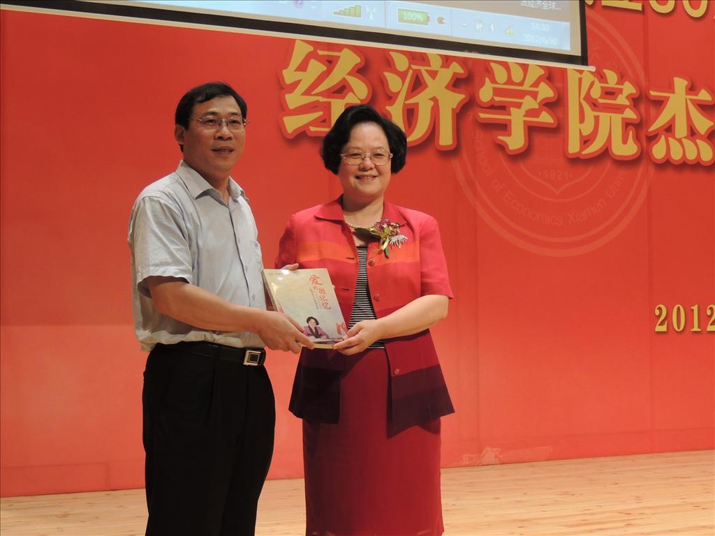 在主题演讲开始之前,院友陈爱京女士为经济学院赠送了她专为院庆撰写的《爱的微记忆——陈爱京人生事业回眸》一书,李建发副校长代表接受捐书仪式。