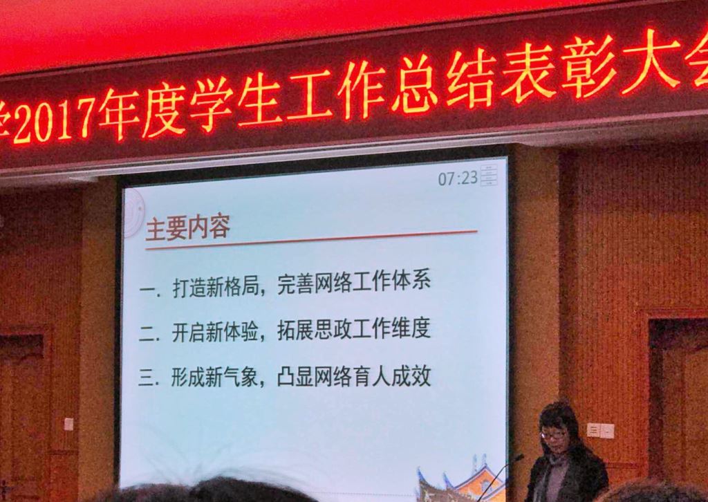 2018年1月19-20日,厦门大学2017年度学生工作总结表彰大会在化学报告厅举行。19日下午,党委副书记王艺宏代表经济学院、王亚南经济研究院作题为“新时代 开启网络育人新篇章”学生工作特色亮点汇报。她着重分享了两院利用网络让主题教育热起来、服务工作暖起来、管理方式活起来的做法和经验,并表示,“互联网+”思政教育要落地生根,必须坚持立德树人的根本任务,围绕学生、关照学生、服务学生,以互联网为媒介,搭建师生之间有效沟通的桥梁;以互联网为工具,解决学生成长成才过程中遇到的困难;以互联网为助推器,在贯彻落实十九大精神、实现厦门大学“双一流”建设的过程中,让学生青春的梦想在万里碧空中展翅翱翔。