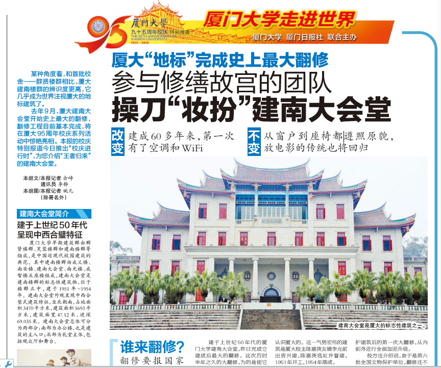 去年9月,厦大建南大会堂开始史上最大的翻修,翻修工程目前基本完成,将在厦大95周年校庆系列活动中惊艳亮相。本报的校庆特别报道今日推出“校庆进行时”,为您介绍“王者归来”的建南大会堂。