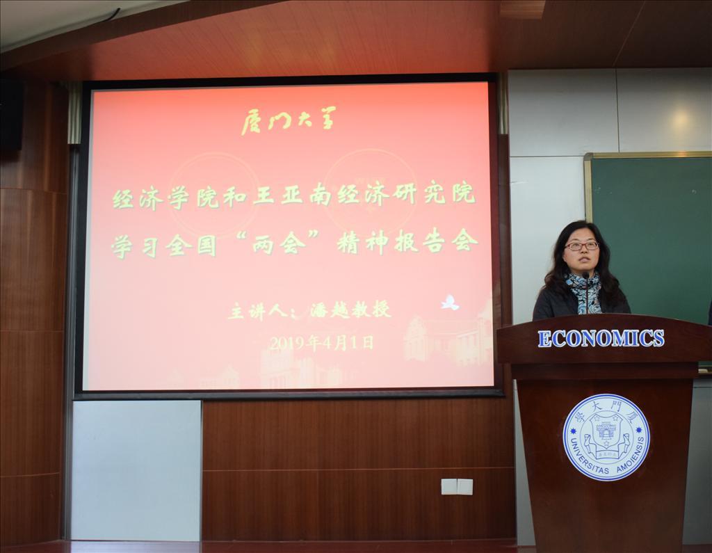 4月1日下午,经济学院和王亚南经济研究院(以下简称“两院”)传达学习十三届全国人大二次会议精神报告会在经济楼N303举行,十三届全国人大代表、厦门大学经济学院金融系教授、博士生导师潘越向两院师生代表传达了十三届全国人大二次会议的基本情况和主要精神。学院党委理论学习中心组成员、教职工代表、学生党支部书记和支委、学生代表等参加报告会。报告会由学院党委副书记周蕾主持。