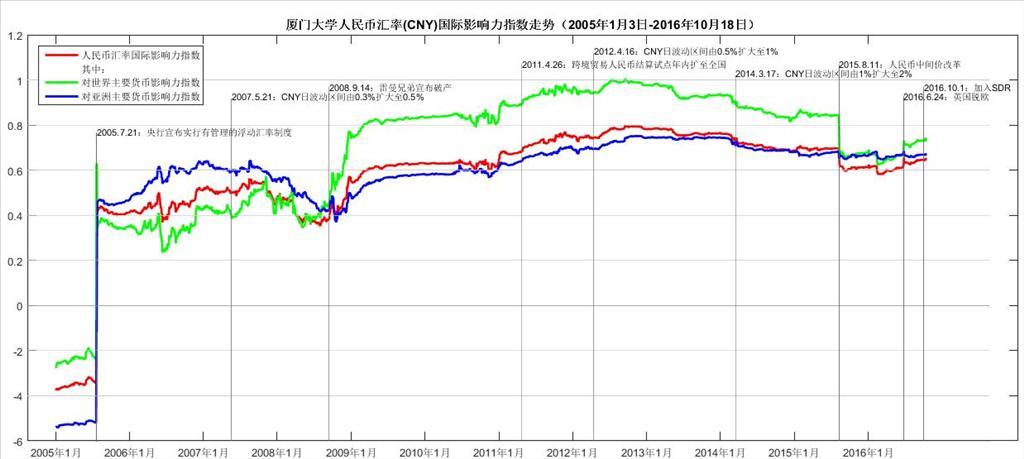 厦门大学人民币汇率国际影响力指数是厦大研究团队运用现代计量经济学方法与工具,以数据分析为基础实证研究人民币汇率在国际上和亚洲地区的影响力,能够及时地跟踪人民币汇率的变化对世界和亚洲主要货币汇率的净影响,不仅很好地展示了人民币国际化进程中历次汇制改革实施后人民币国际影响力的变动,还可以定量分析重大国际国内经济事件发生后人民币国际影响力的变动。自2016年6月6日首次发布以来,厦门大学人民币汇率国际影响力指数受到了社会各界的广泛关注。