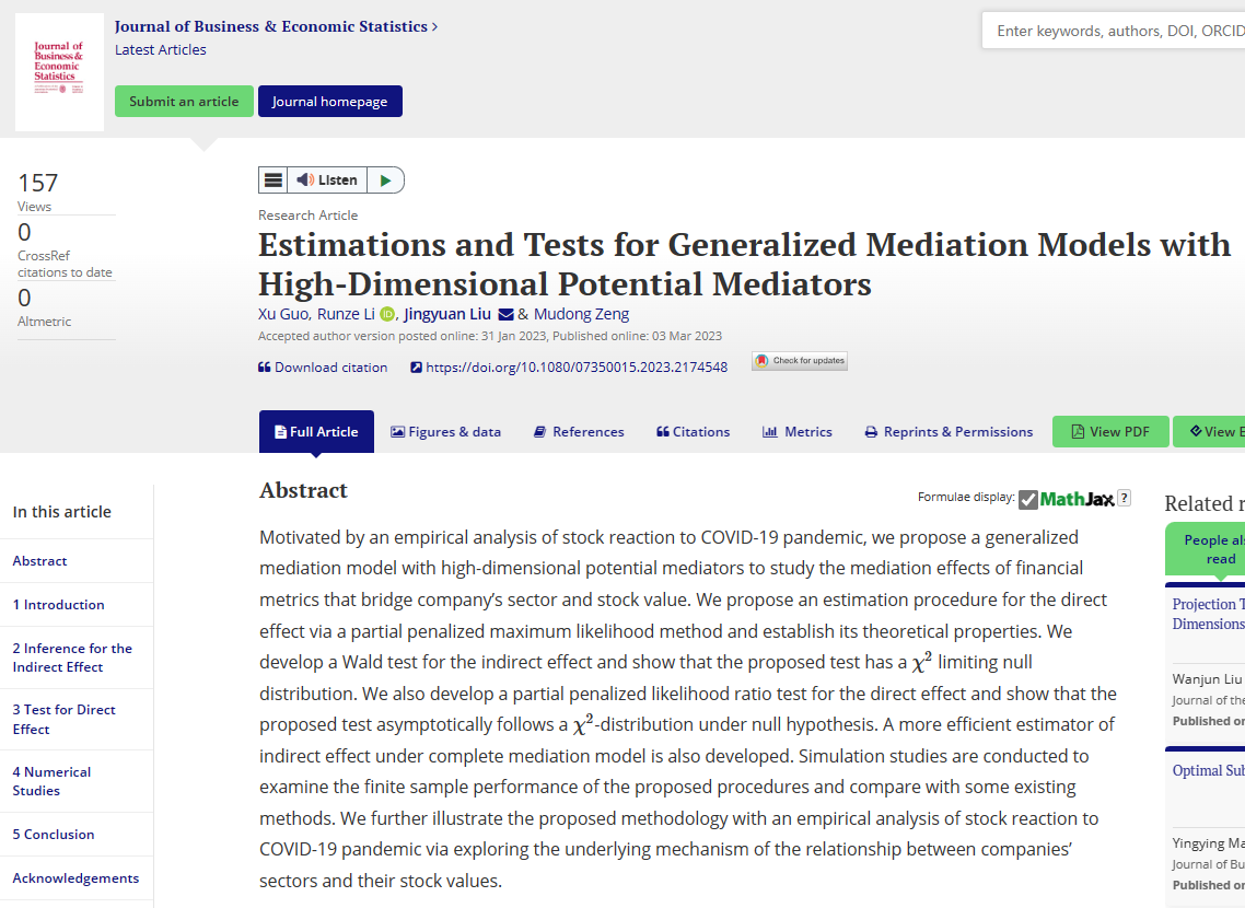 近日,经济学科青年教师刘婧媛教授,与北京师范大学郭旭副教授,宾夕法尼亚州立大学李润泽教授、曾沐冬博士合作的题为“Estimations and Tests for Generalized Mediation Models with High-Dimensional Potential Mediators”的论文在统计学与计量经济学国际权威期刊Journal of Business & Economic Statistics在线发表。
