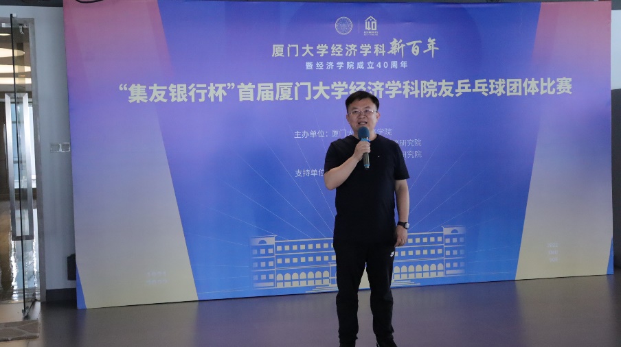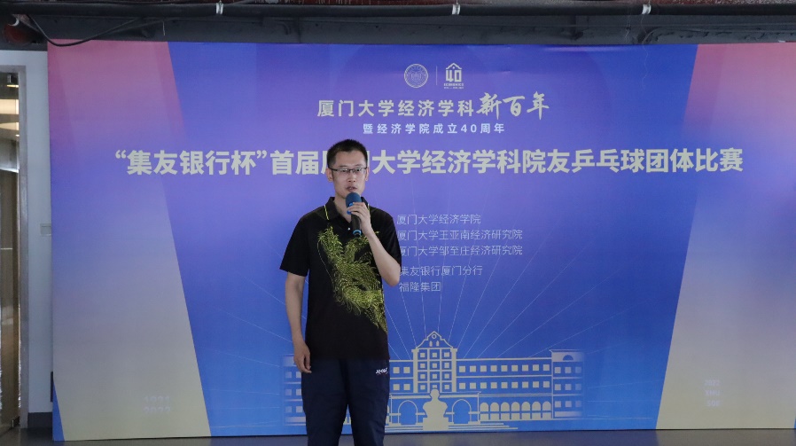 赛后,经济学院党委书记高忠华作总结讲话,他鼓励大家继续坚持乒乓球作为锻炼身体和脑力的体育活动,让毕业院友、在校师生能有更多切磋、交流的机会;随后,经济学院1989级校友、福隆集团常务副总王江斌发言,他借此比赛欢迎经济学科校友多回世纪中心厦大校友会经济分会校友之家看看,鼓励经济学科师生身体力行传播“国球文化”。最后,2018级金融系博士毕业生、厦门市国资委叶展作为参赛代表发言,他身穿印有“厦大经院”字样的纪念队服发言,感谢经济学科搭建了良好的院友交流平台,鼓励大家一起投入全民健身。值得一提的是,在本次比赛近30名参赛队员中包括了4名厦门大学学生乒乓球协会会长。
