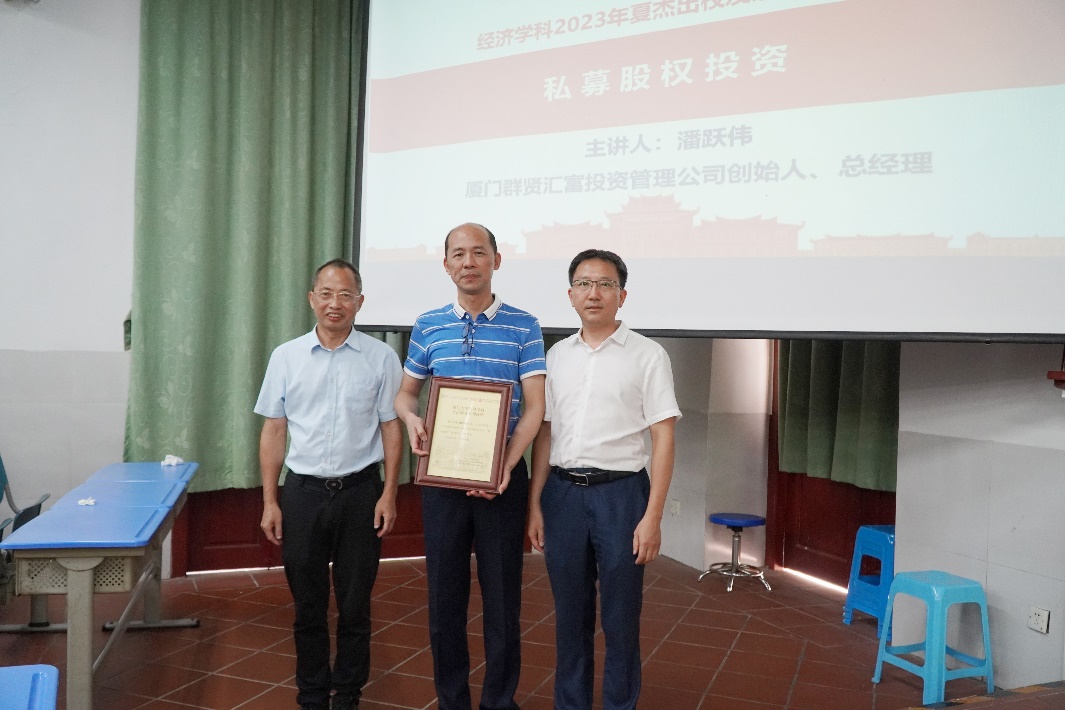 7月24日下午,厦门群贤汇富投资管理公司创始人、总经理潘跃伟在厦大群贤二102教室带来一场题为“私募股权投资”的精彩讲座。讲座伊始,经济学院副院长谢贞发、经济学院原党委书记黄鸿德为潘跃伟颁授该系列讲座纪念牌。