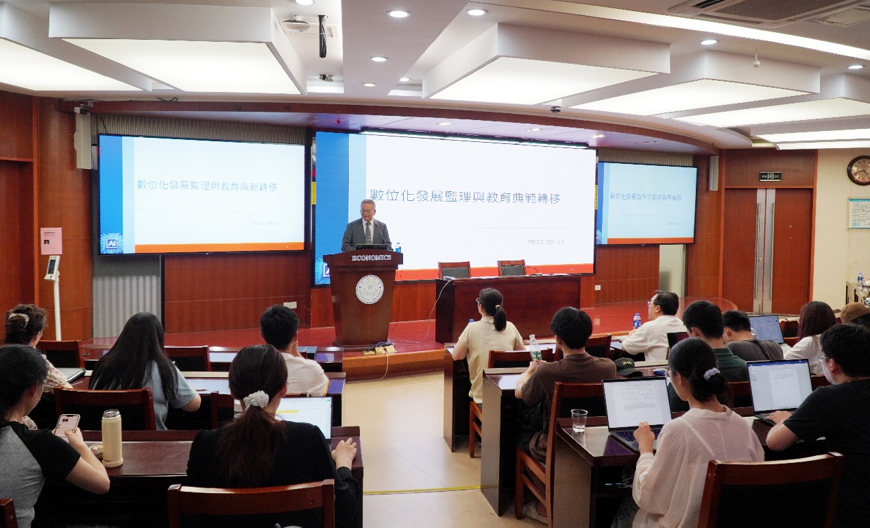 9月22日下午,厦门大学富邦大讲堂经济金融系列第2期在厦大经济楼开讲。台湾政治大学会计研究所兼任教授、台湾地区投资股份有限公司董事长、台湾证券交易所前董事长陈树博士应邀作题为“数字化发展监理与教育典范转移”的报告。