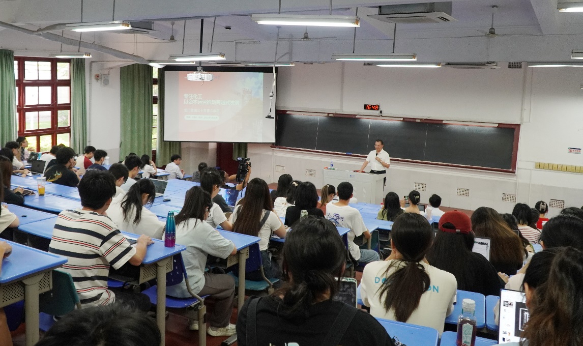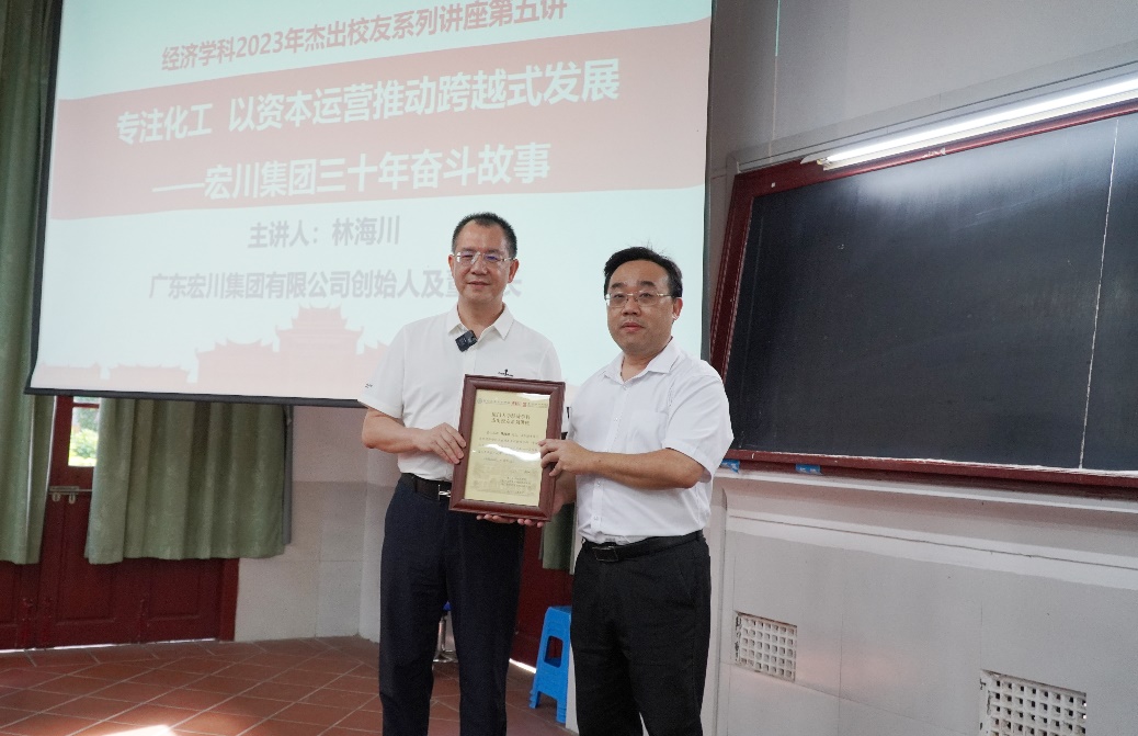 7月26日下午,厦大经济学科2023年夏季学期杰出校友系列讲座第五讲在群贤二102教室顺利举办。厦大89级财经系院友,广东宏川集团创始人、董事长林海川先生应邀作了题为“专注化工 以资本运营推动跨越式发展——宏川集团三十年奋斗故事”的精彩讲座。讲座伊始,厦门大学经济学院、王亚南研究院院长周颖刚教授为主讲人颁授该系列讲座纪念牌。