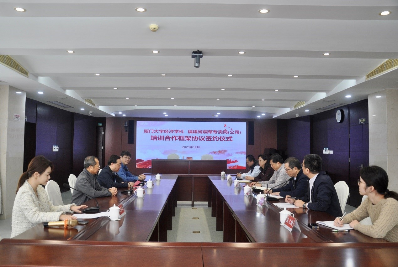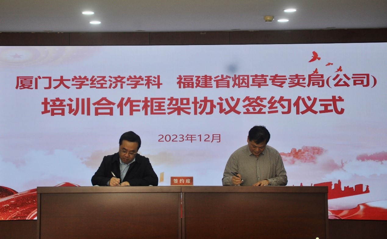 12月13日上午,厦门大学经济学科、福建省烟草专卖局(公司)培训合作框架协议签约仪式在福建省烟草专卖局教育培训中心成功举行。厦门大学经济学院、王亚南经济研究院院长周颖刚,福建省烟草专卖局(公司)党组成员、副总经理林师训,厦门大学党委专职巡视员、经济学院原党委书记黄鸿德出席仪式。